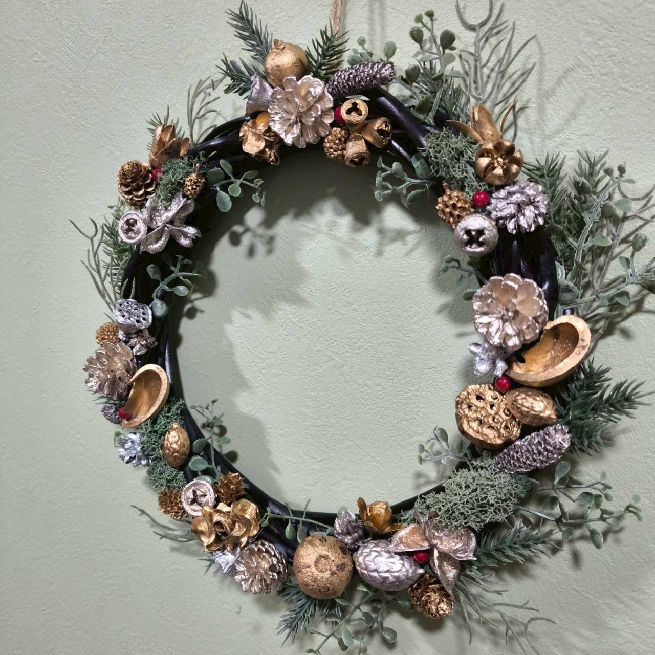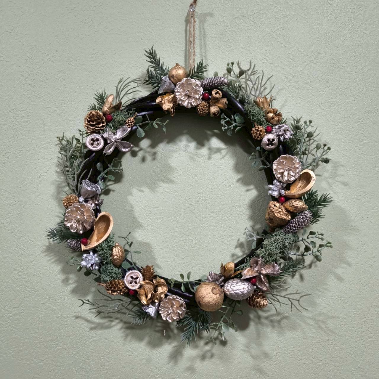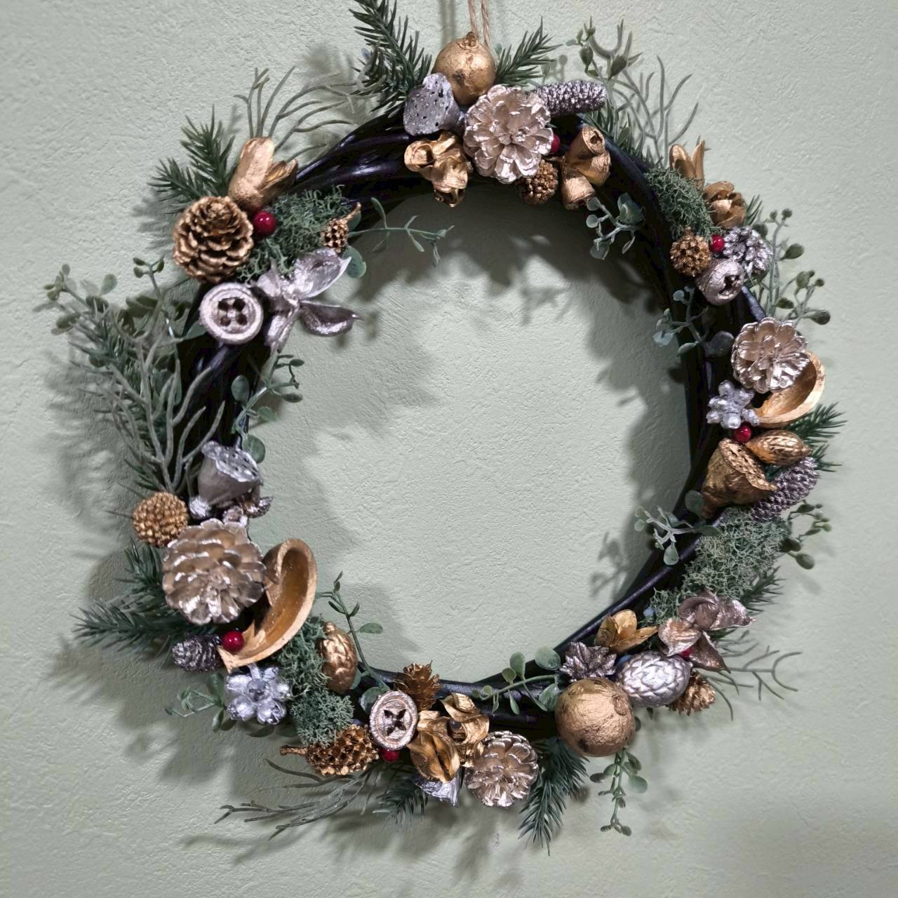 黒のベースにシルバーとゴールド色に統一した木の実をバランスよく全体的に散りばめて、フェイクの植物でも落ち着いた緑系の色味でリアルに自然に生えているように動きを出しました。赤い実がさりげなくアクセントになっていてクリスマスカラーでまとめた大人っぽいクールモダンな雰囲気のリースです。