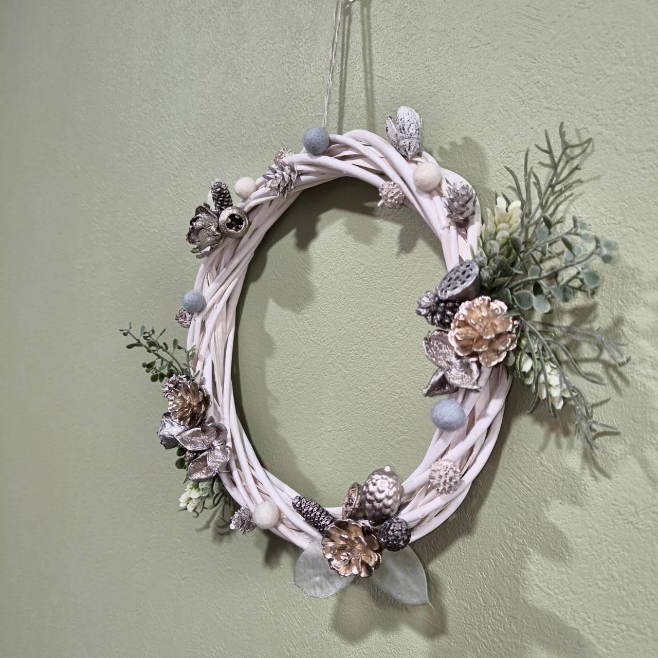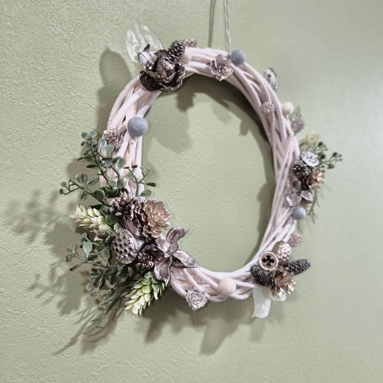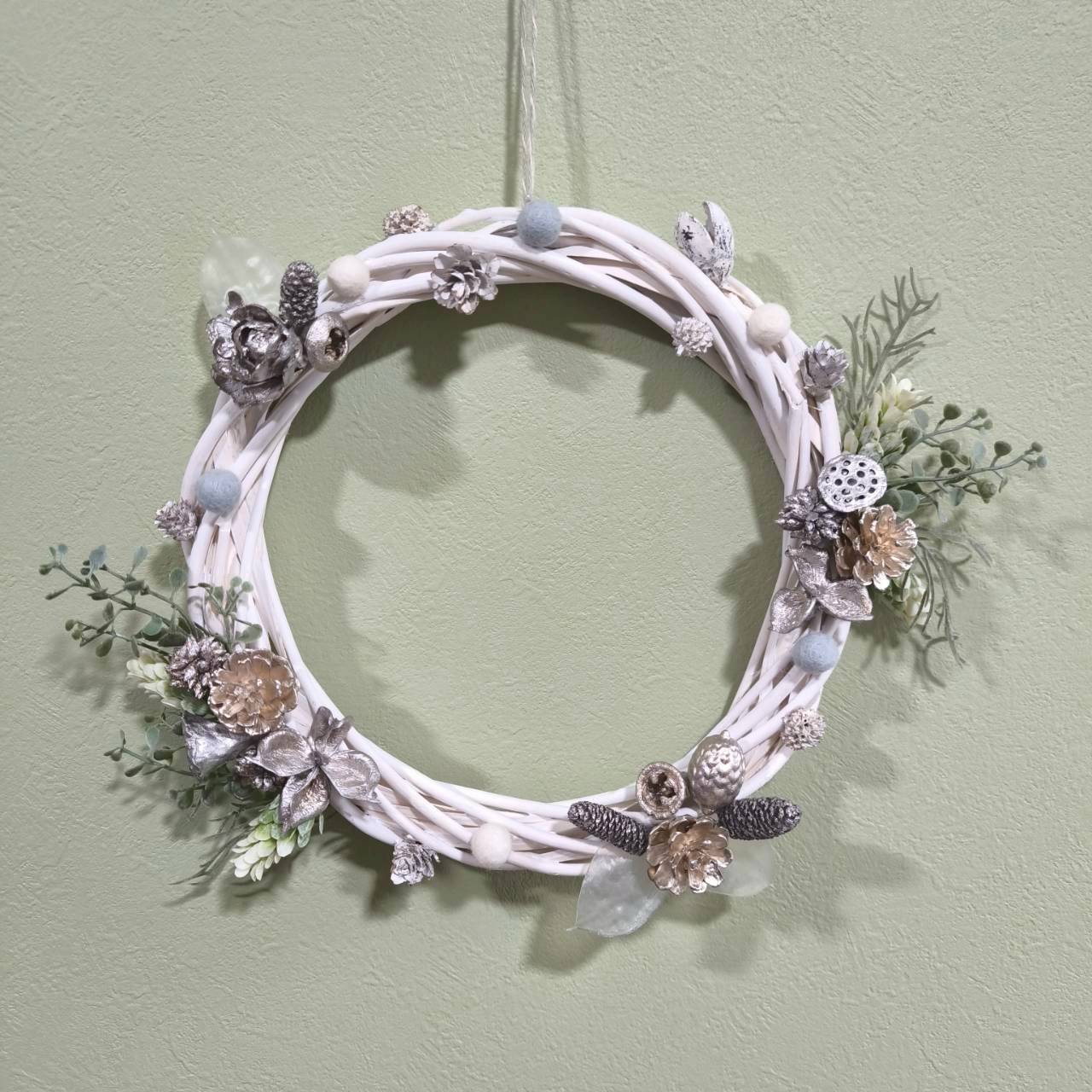 白ベースにシルバー系の木の実で色のトーンを淡く合わせて、シンプルで爽やかキレイめな雰囲気を意識して作りました。斜めに2ヶ所ボリュームを持たせ、余白部分にはフェルトボールをあしらって可愛らしさを出しました。