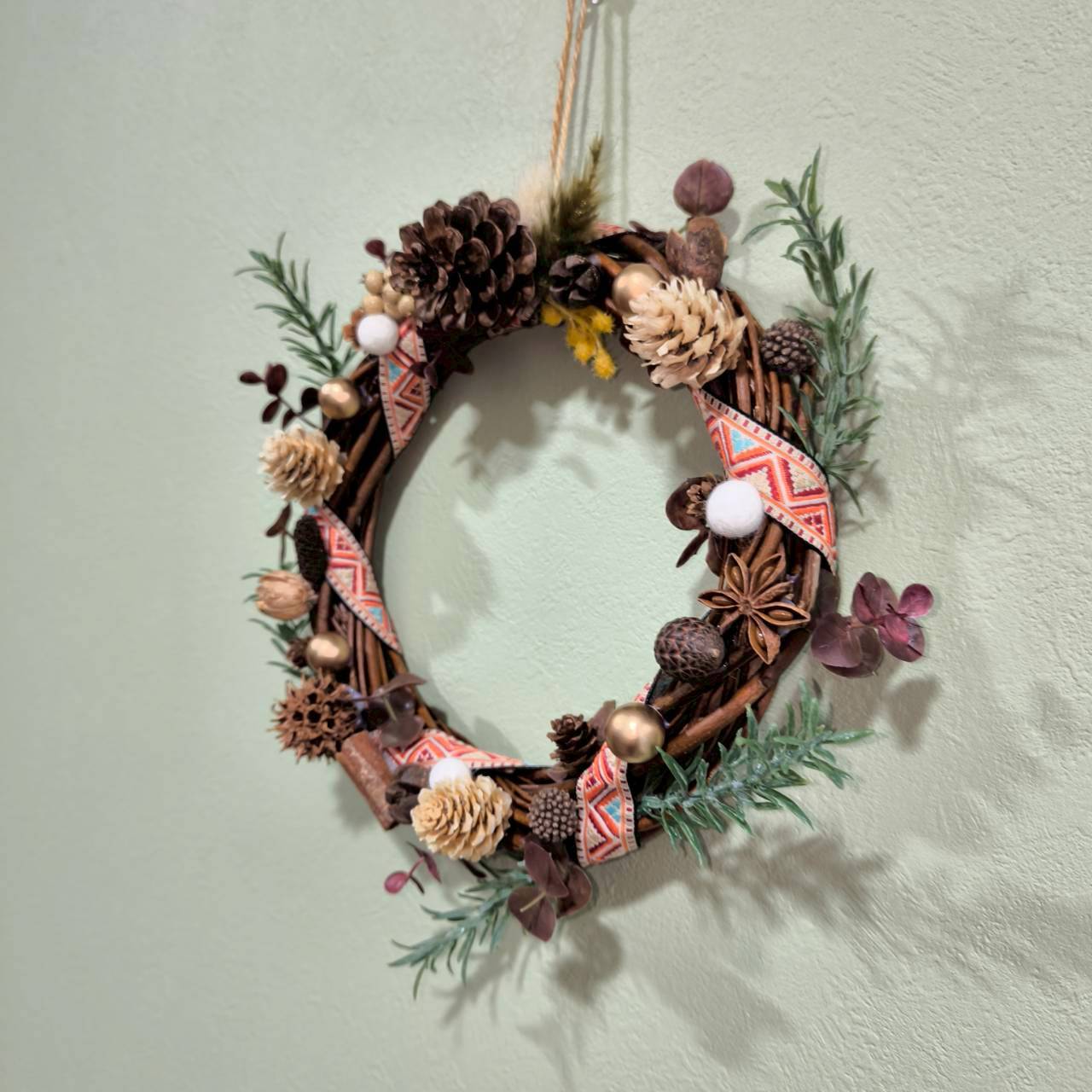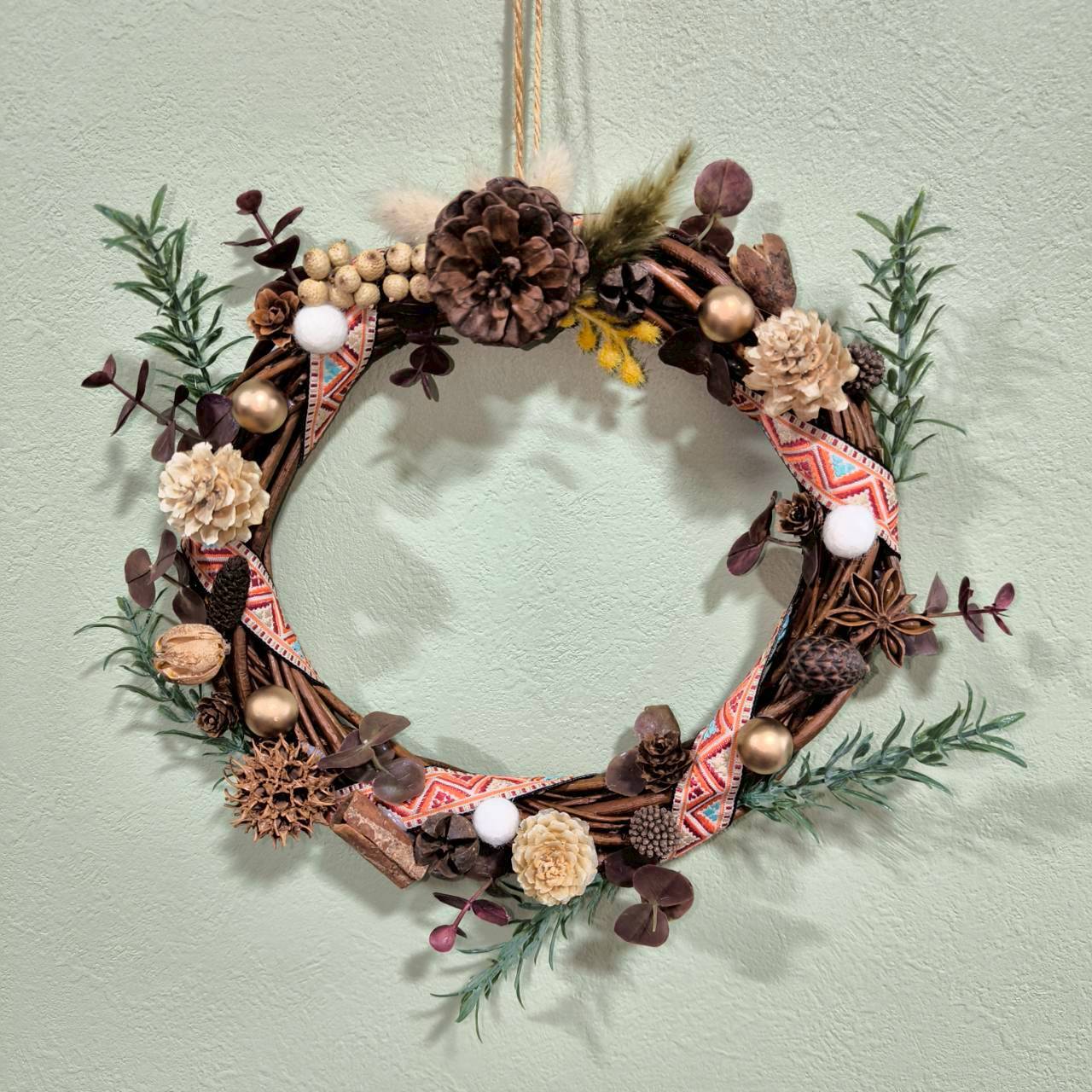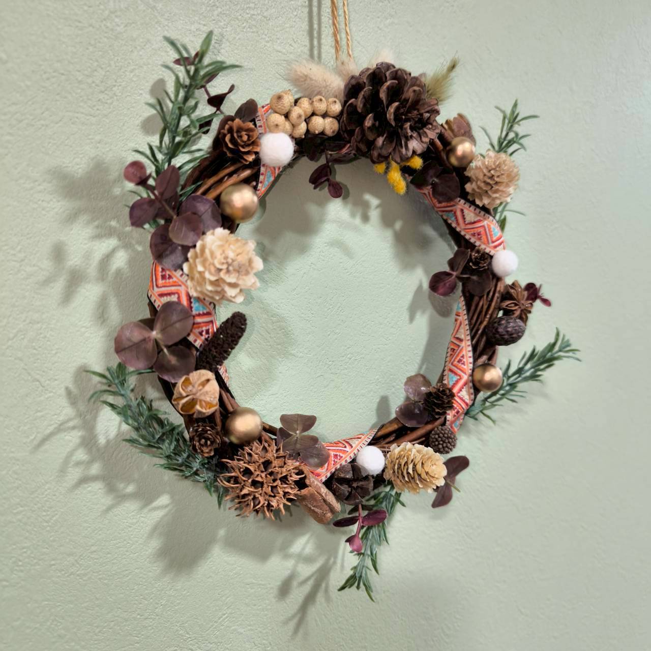 エスニックやノルディックな雰囲気漂う柄が目を引く朱赤のリボンをアクセントに、全体的に茶系の木の実でまとめて、さりげなく植物を周りにあしらい、ほっこりした暖かみとナチュラルさを表現したリースです。