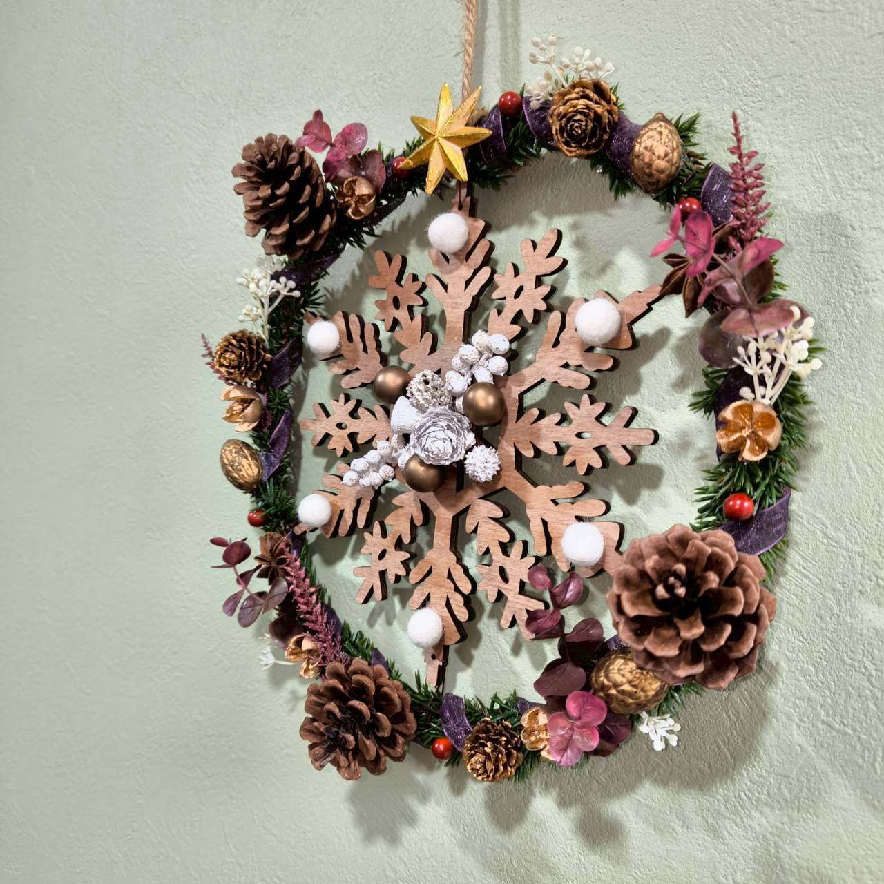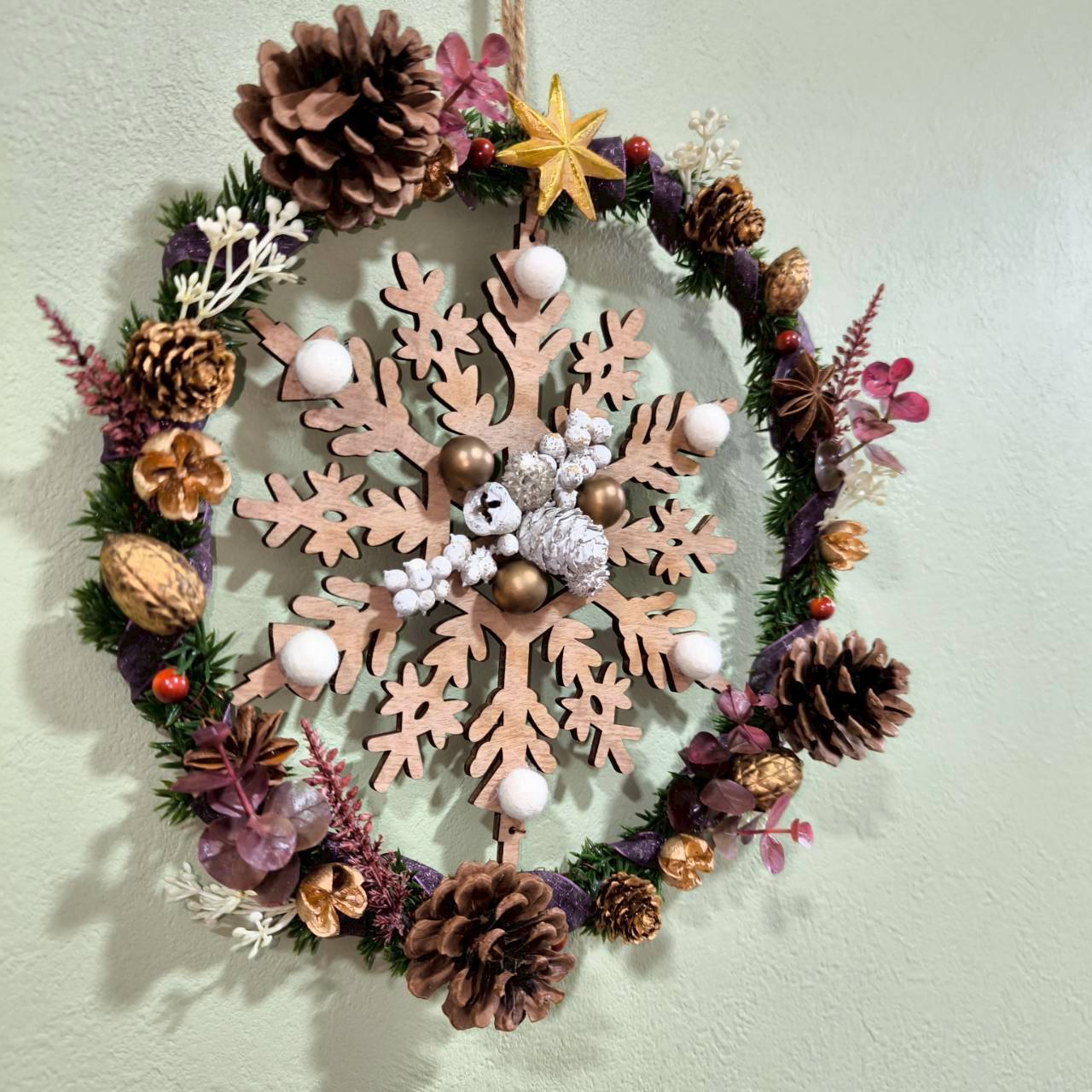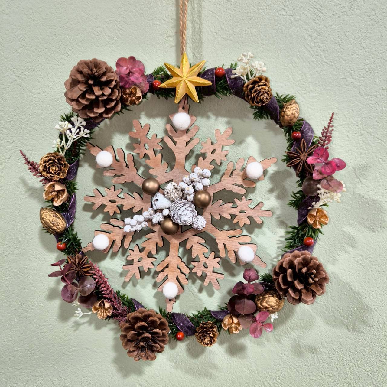 グリーンの柊リースに、中央には木製の雪の結晶モチーフが付いたベース。そこにほっこり可愛いらしい白のフェルトボールを結晶に付け、回りは白、ゴールド、茶色ベースの木の実を全体的に散りばめました。紫のオーガンジーリボンが巻かれていて差し色とアクセントになっていて、それに合わせたワインレッド系の葉で色味に統一感を出しています。