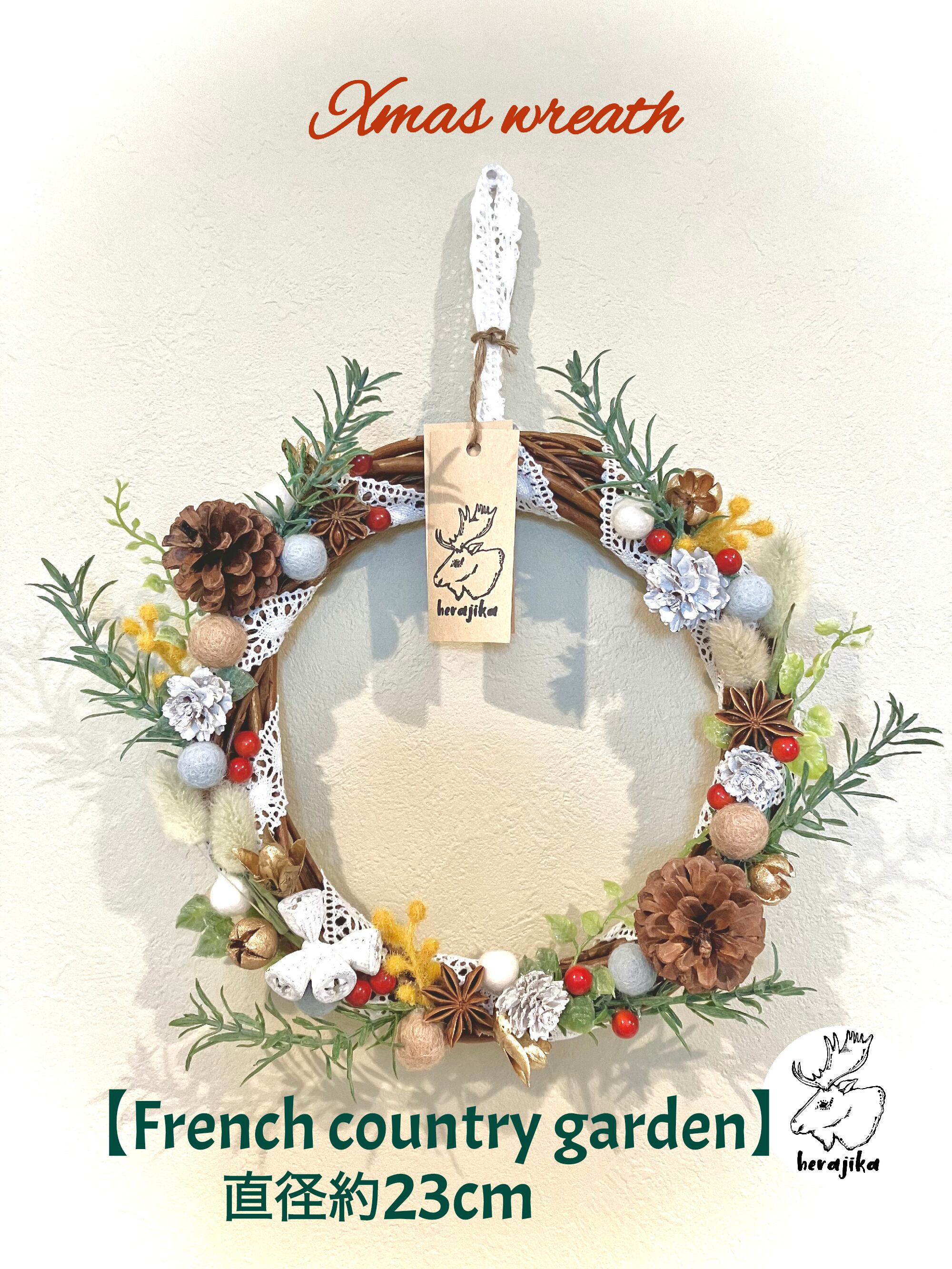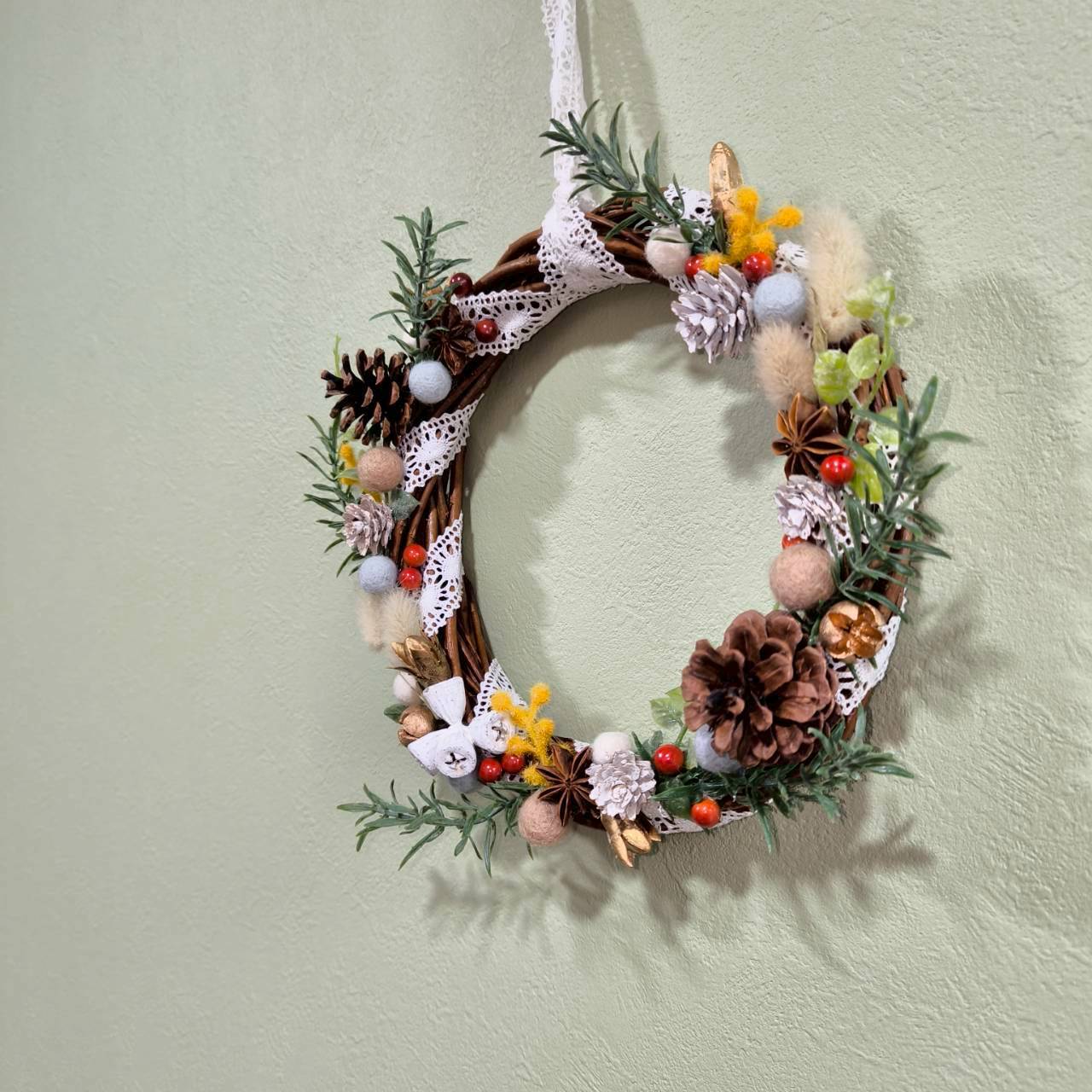 茶色の柳リースをベースに、白いレース編みのリボンを一周巻き着けて、フレンチカントリー調にしました。そこに白・茶色・ゴールドの木の実や、フェルトボールを散りばめ、ミモザの黄色と赤い実の色がアクセントになっています。造花の植物はローズマリーとアイビーでお庭の草花を使って手作りしたかのような、ナチュラルな素朴さと可愛いらしさを表現しました。