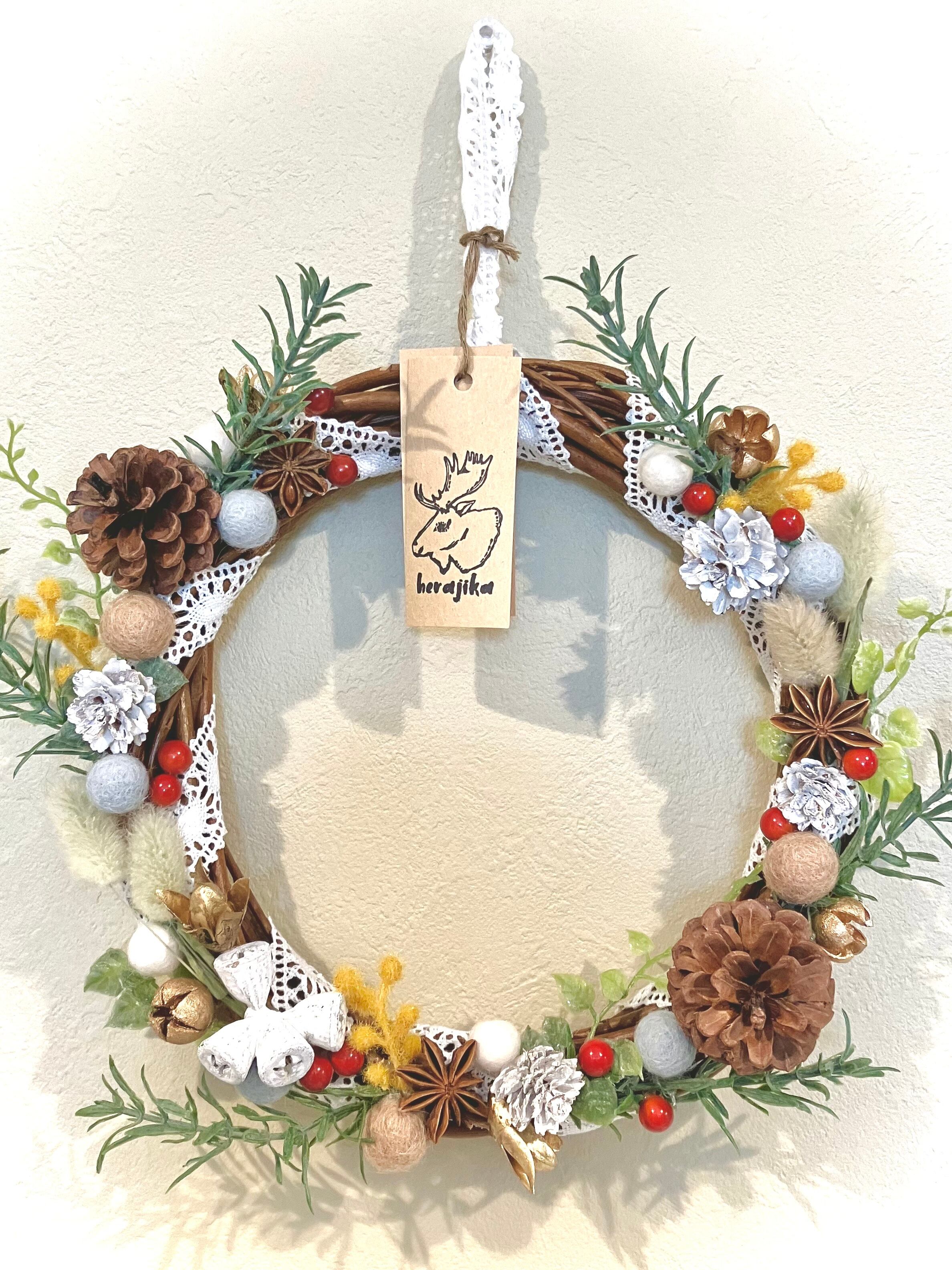 ・パーツ…天然素材の木の実・草花植物等と、フェイク(造花)の草花植物・フェルトやリボン等のファブリック類、パールボールやオーナメント等のプラスチック製やレジン(合成樹脂)をミックスして製作しています。
